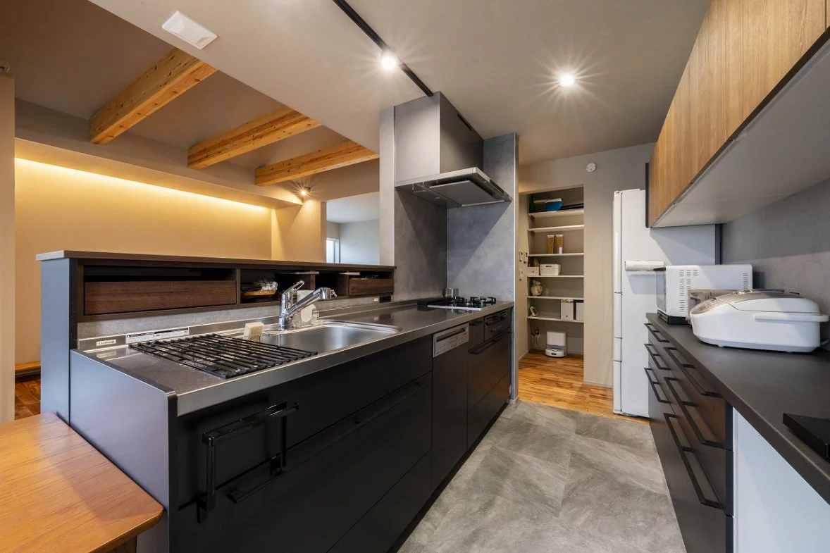 外構部分は白基調、建物はブルーグレーの外壁に片流れ屋根が目を惹くスタイリッシュデザインに仕上げられています。外観デザイン以上に、施主のご夫妻が大きなこだわりとしたのが機能性です。共働きで小さなお子さん2人を持つご夫妻のリクエストで、キッチンで家事をしながらリビング全体が見渡せるようにし、またご主人のリモートワークスペースもリビングが見渡せるように配置しました。また、拭き抜けやウッドデッキで行き来できる中庭を配置し、開放感にも満ちています。